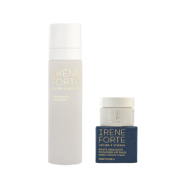 This indulgent pairing delivers targeted nourishment for your evening wind-down. The Pomegranate Hand Cream absorbs quickly, hydrating with Vitamin B5, Calendula, and Omega-Rich Oils, while Olive Oil Fractions help strengthen and protect the skin barrier. The Pistachio Lip Balm cushions lips with Vitamin E and botanical oils, sealing in moisture with a soft, protective veil. Together, they restore comfort and hydration—perfect for overnight renewal or daily care.